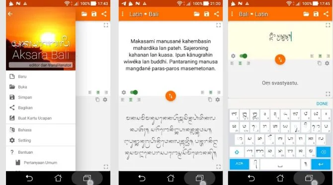 Terakhir ada aplikasi translate yang biasa disebut dengan Balinese Script. Aplikasi ini bisa membantu Anda untuk menerjemahkan Bahasa Bali ke Indonesia dengan mudah.
