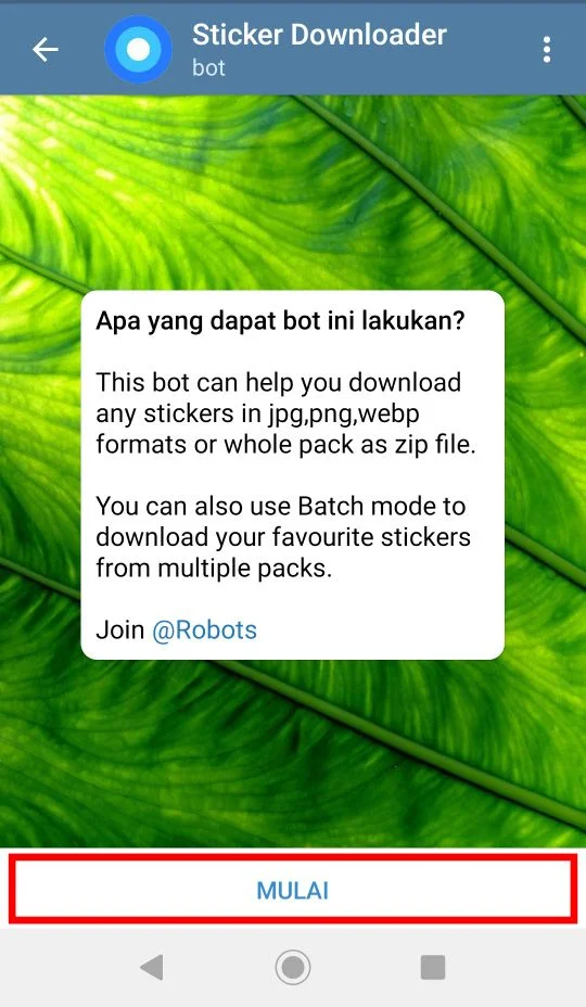 - Pada Ruang Obrolan Bot > Klik Mulai